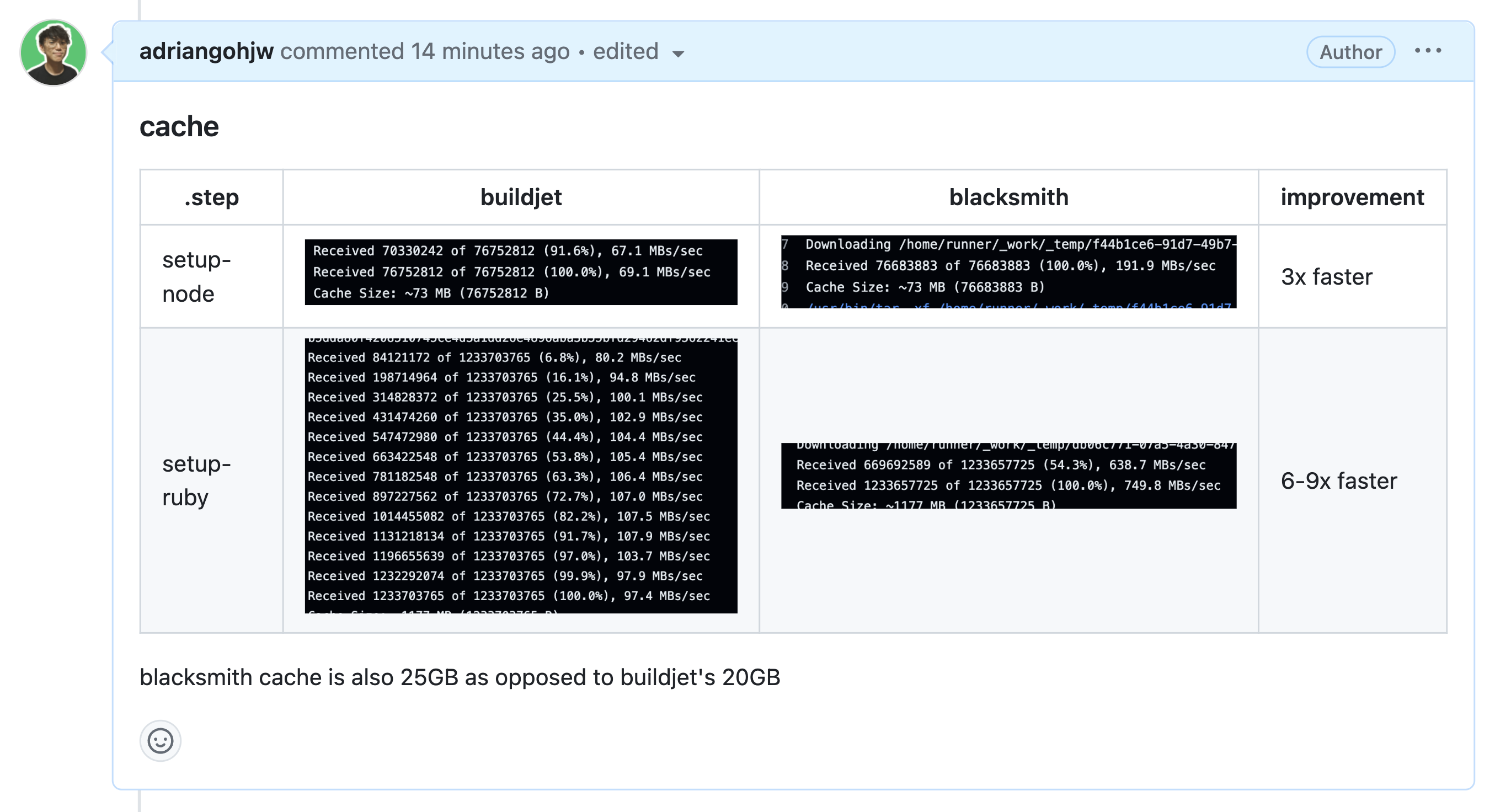 What made us switch from BuildJet was their Colocated Cache. In our brief benchmarks, it is much faster—approximately 7 times faster — jumping from around 100MB/s to 700MB/s.