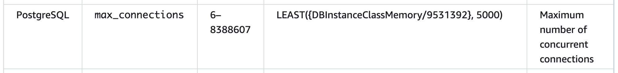 We are using Amazon Relational Database Service (RDS) for our PostgreSQL database, and the maximum number of connections for PostgreSQL is preset based on the database’s RAM, calculated using the formula LEAST({DBInstanceClassMemory/9531392}, 5000).